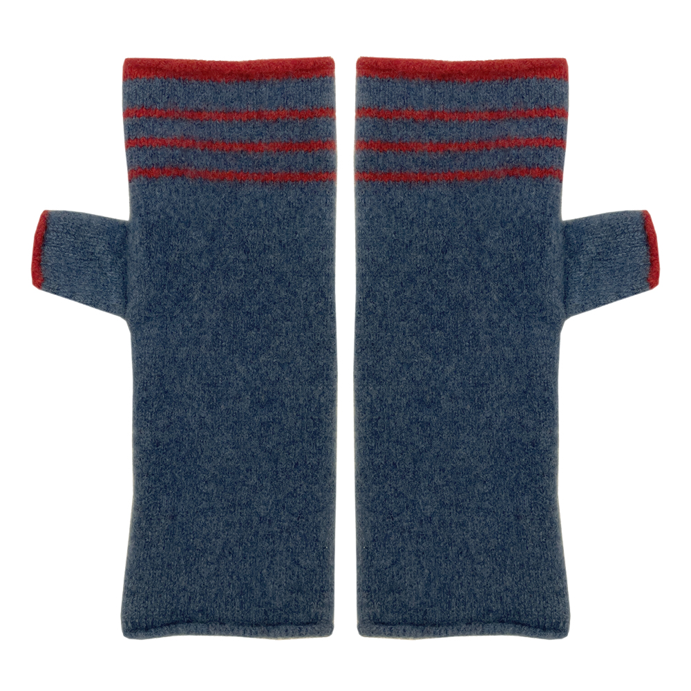 Three striped two colour fingerless gloves - denim blue with red stripes