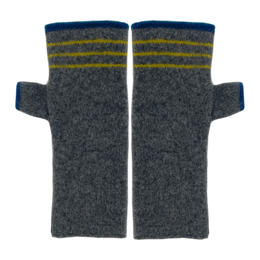 Three striped two colour fingerless gloves- mid grey with turmeric yellow stripes and naval blue trims.