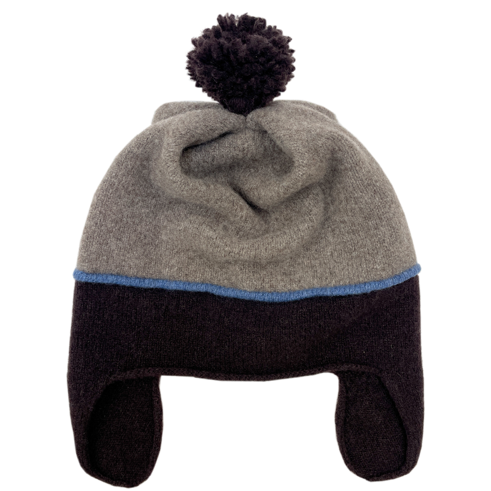 Earflap hat with pom pom - dark brown and beige with blue stripe